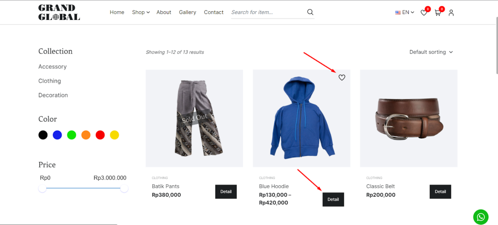 - Click on the Detail button or click on the love icon on the product (to insert it into the wishlist)